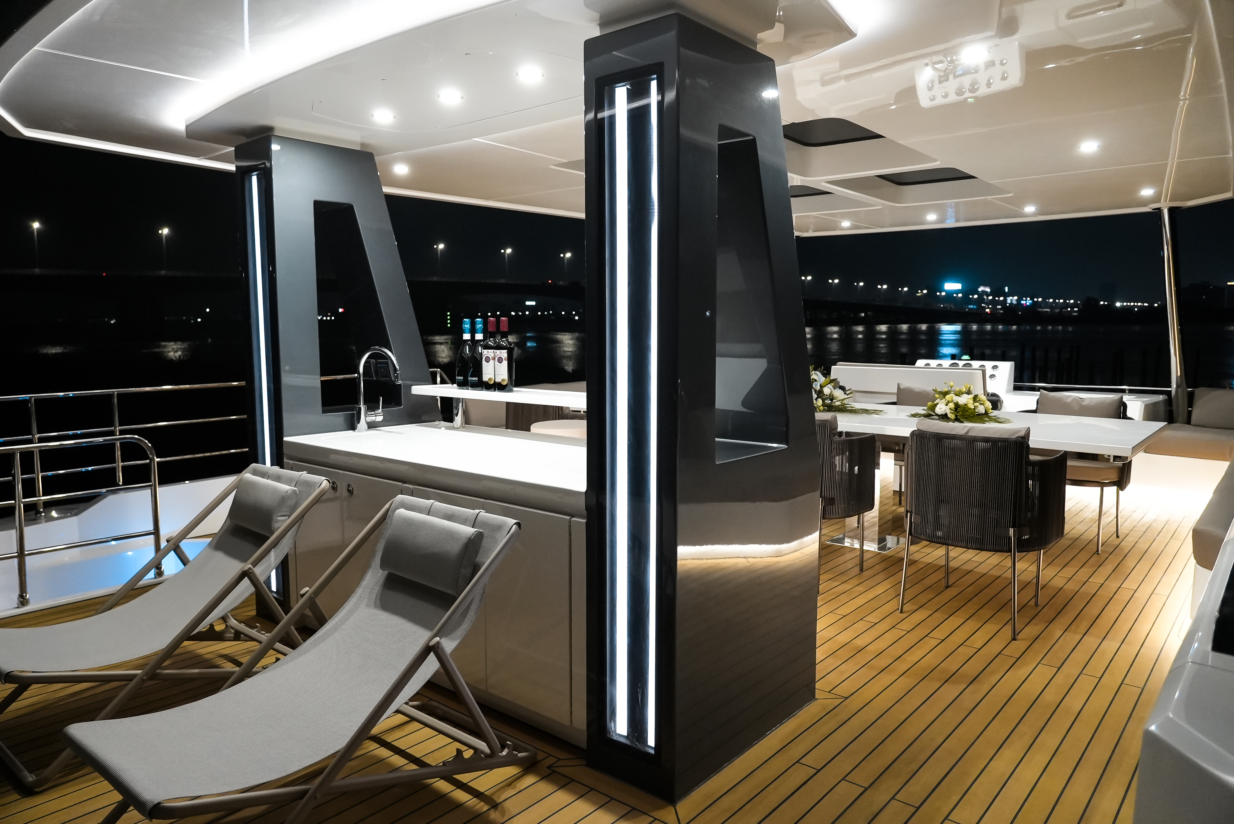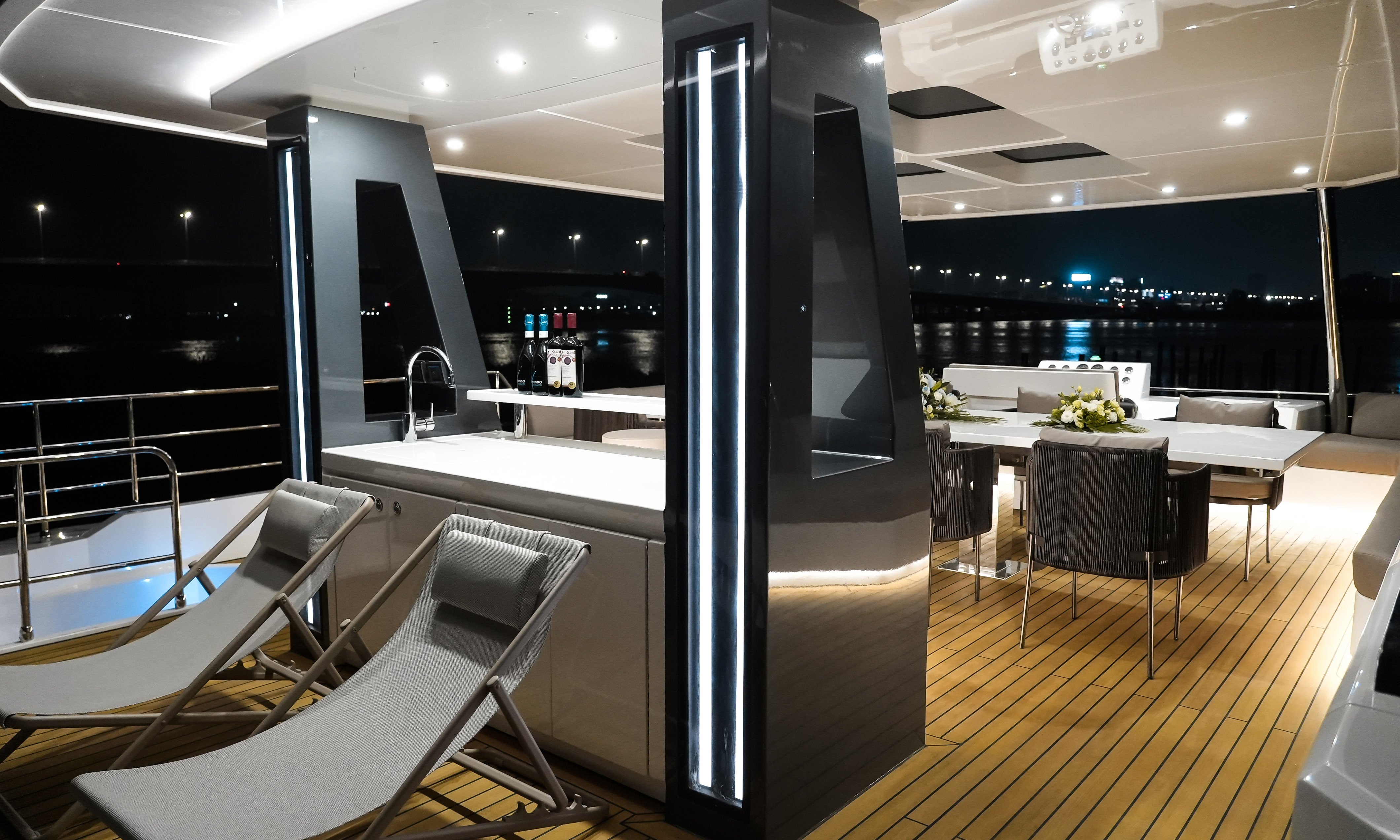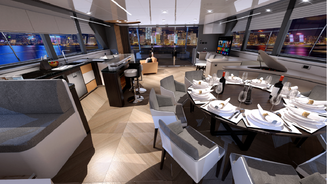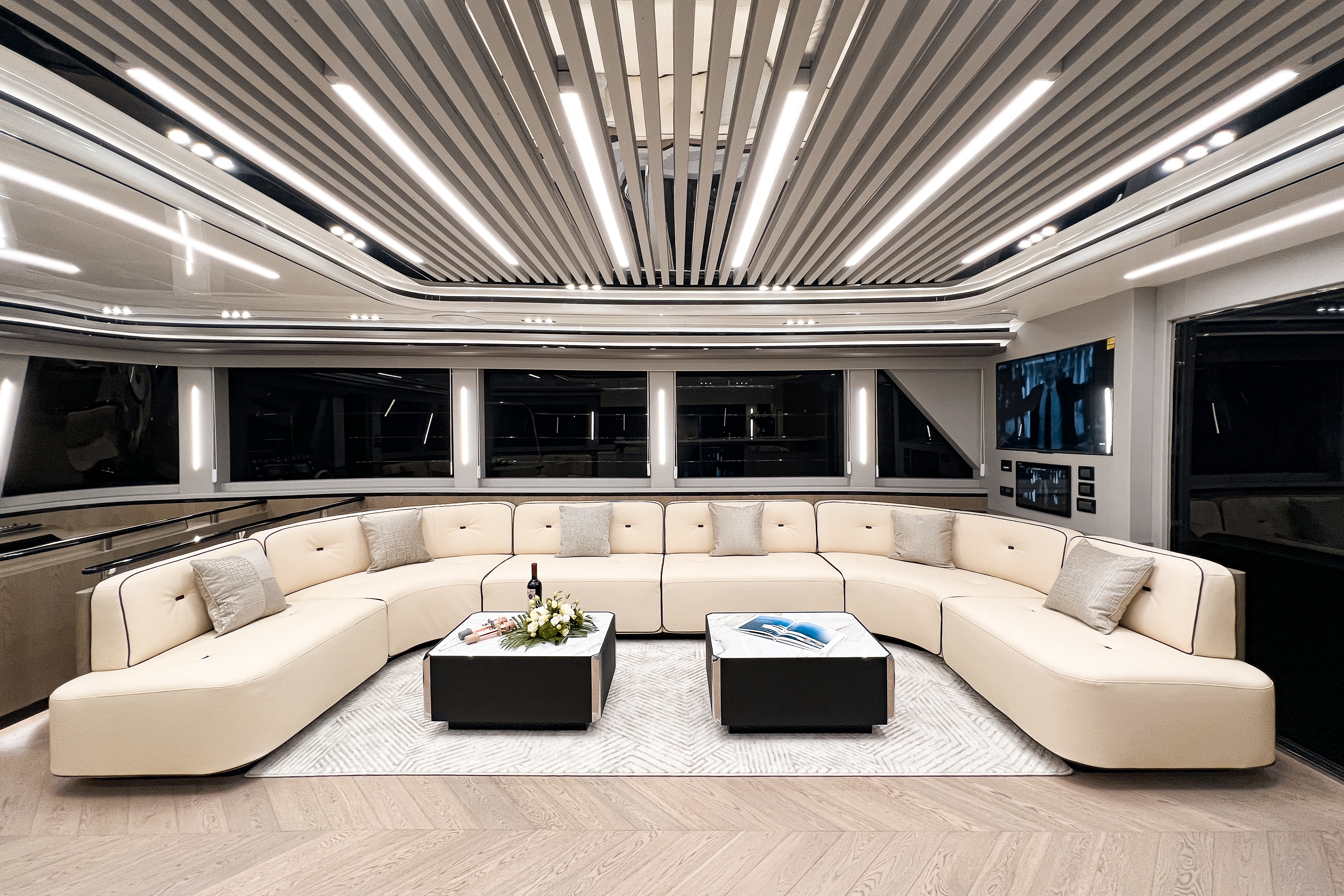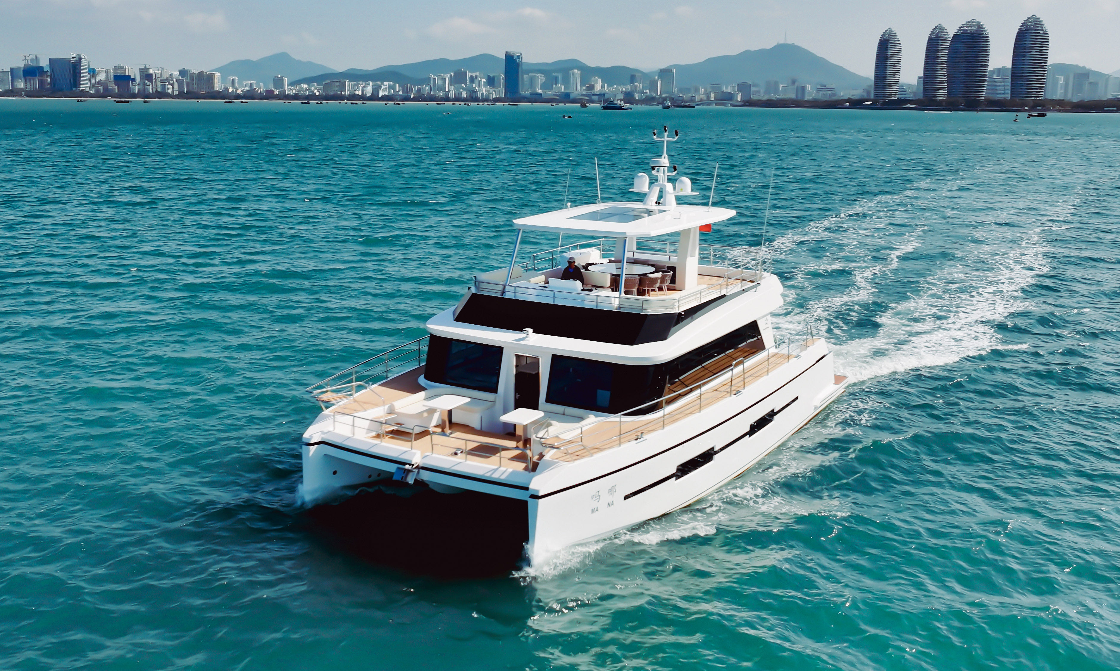 時(shí)尚硬朗的戰(zhàn)斧外形,沉穩(wěn)凌厲的垂直船艏,剛勁有力的線條融入船身輪廓,巨型長(zhǎng)條舷窗加持,TY560雙體動(dòng)力商務(wù)游艇以霸氣之軀穿梭于海平面之間。