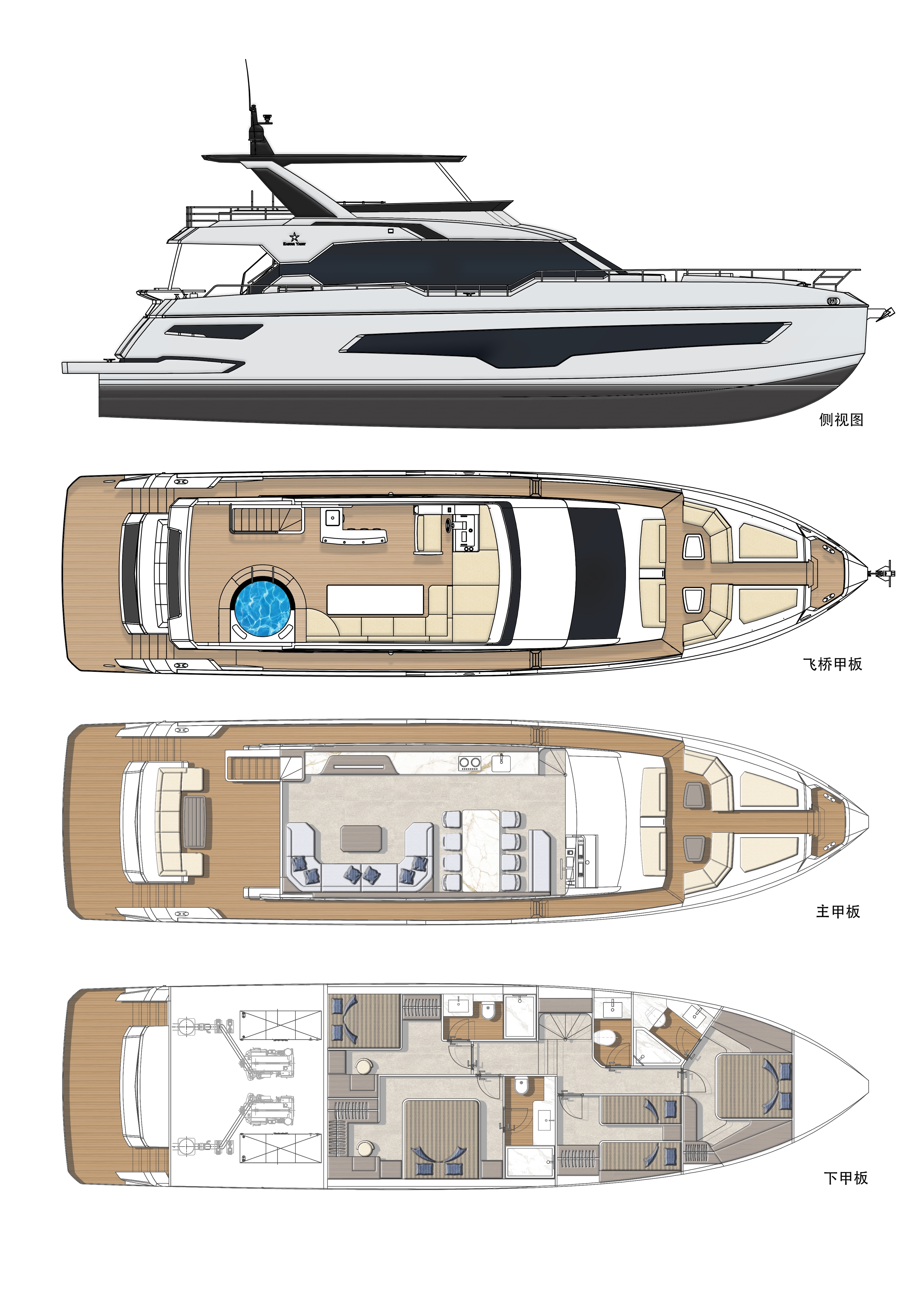 下甲板多功能廳,滿足美學(xué)和時(shí)尚的藝術(shù)理念,各種布局完美的局部設(shè)計(jì),更加增強(qiáng)了該艇外觀的現(xiàn)代型風(fēng)格。
