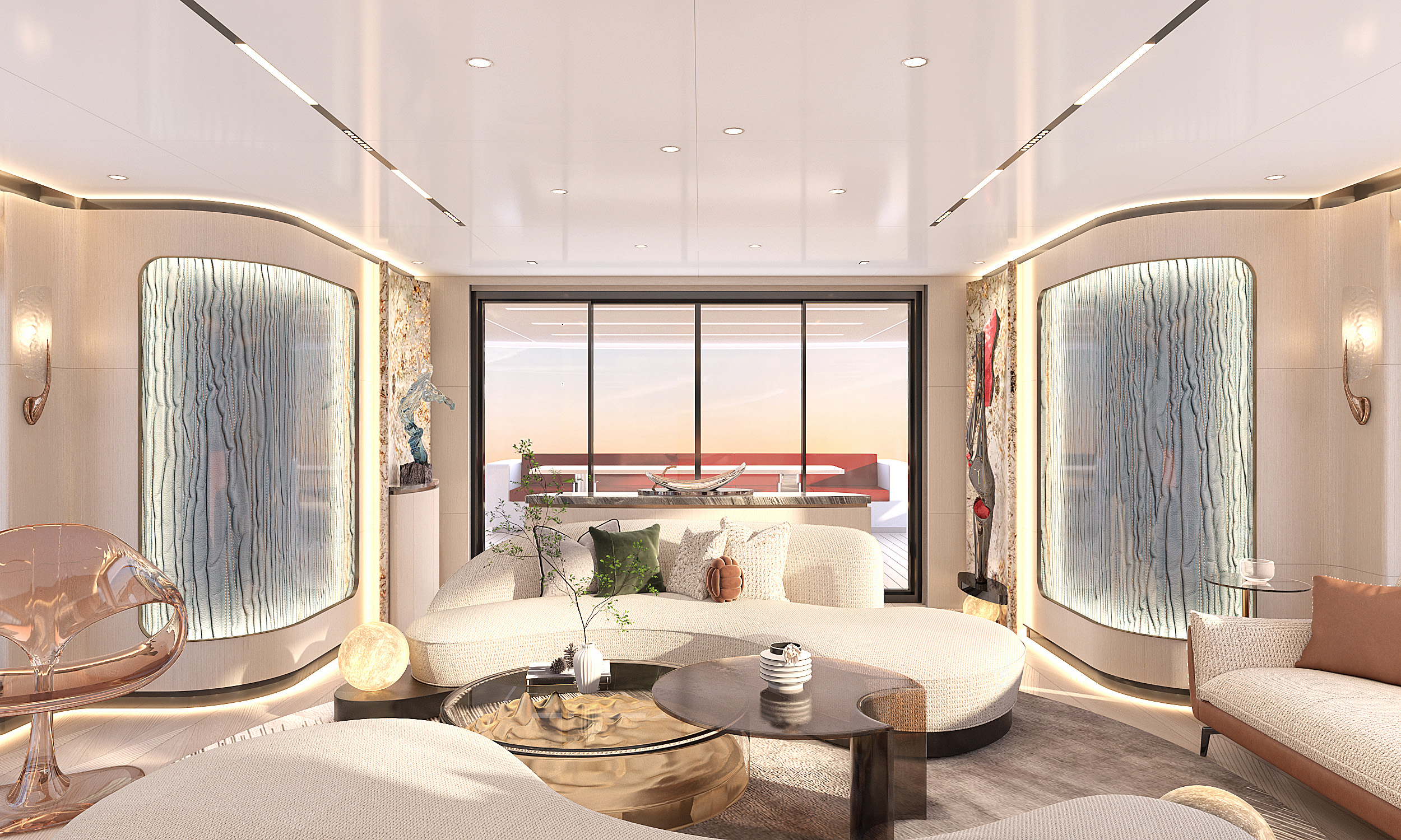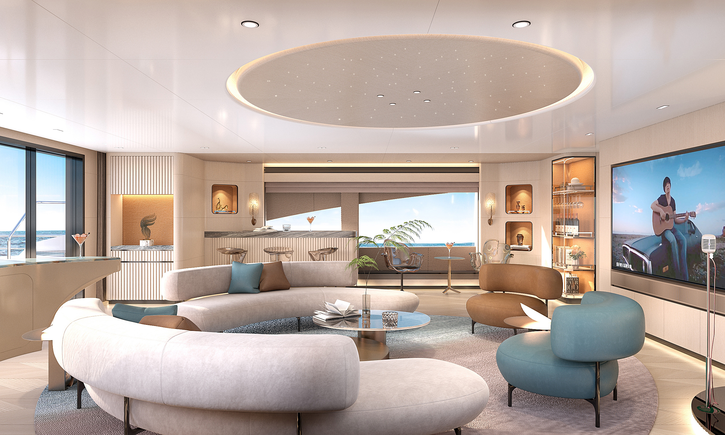 步入沙龍,首先被其寬敞開闊的空間所震撼。挑高的天花板搭配巨大的全景舷窗,讓自然光線毫無保留地傾瀉而入,營造出通透明亮的氛圍,同時(shí)將壯麗的海景盡收眼底。