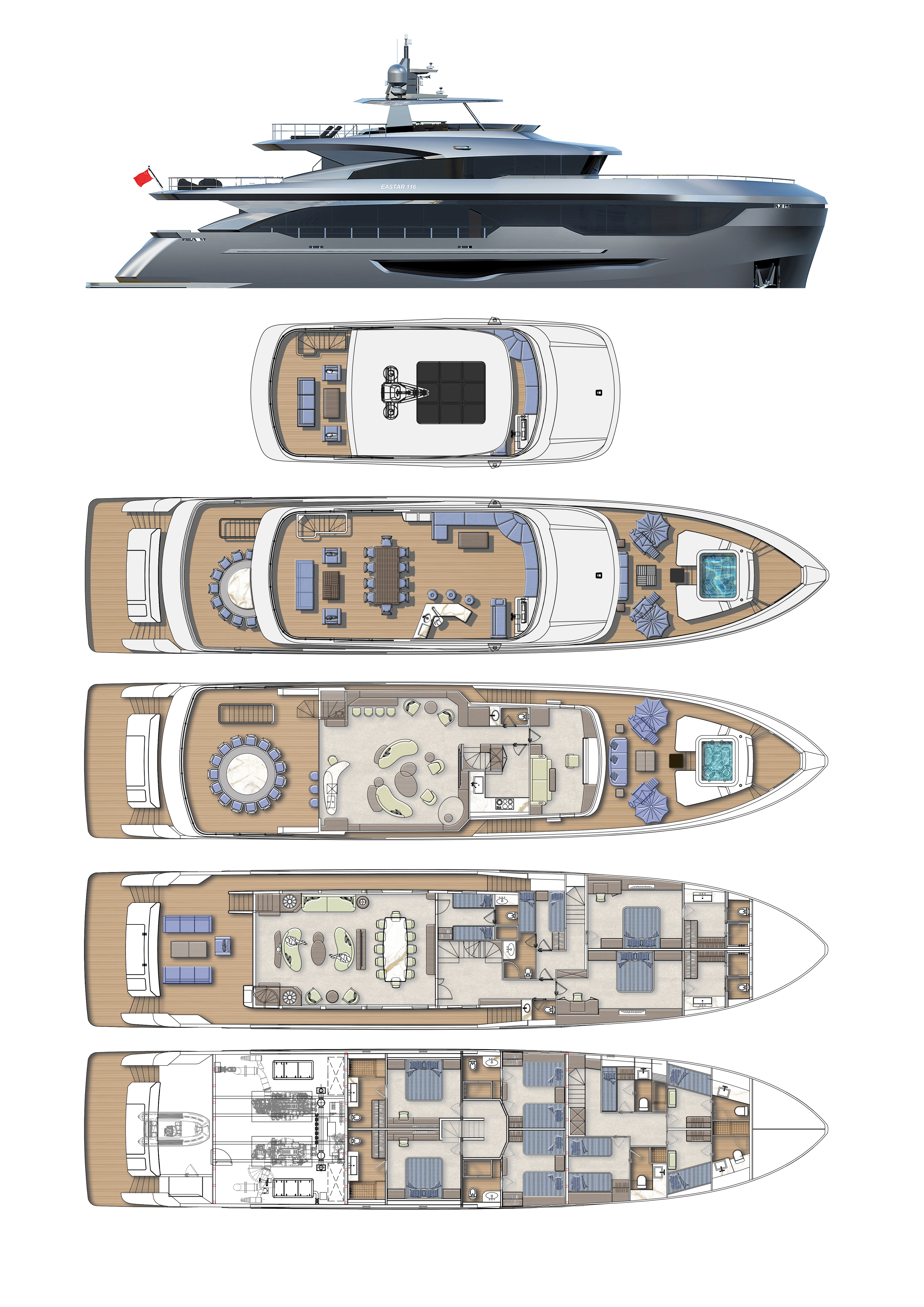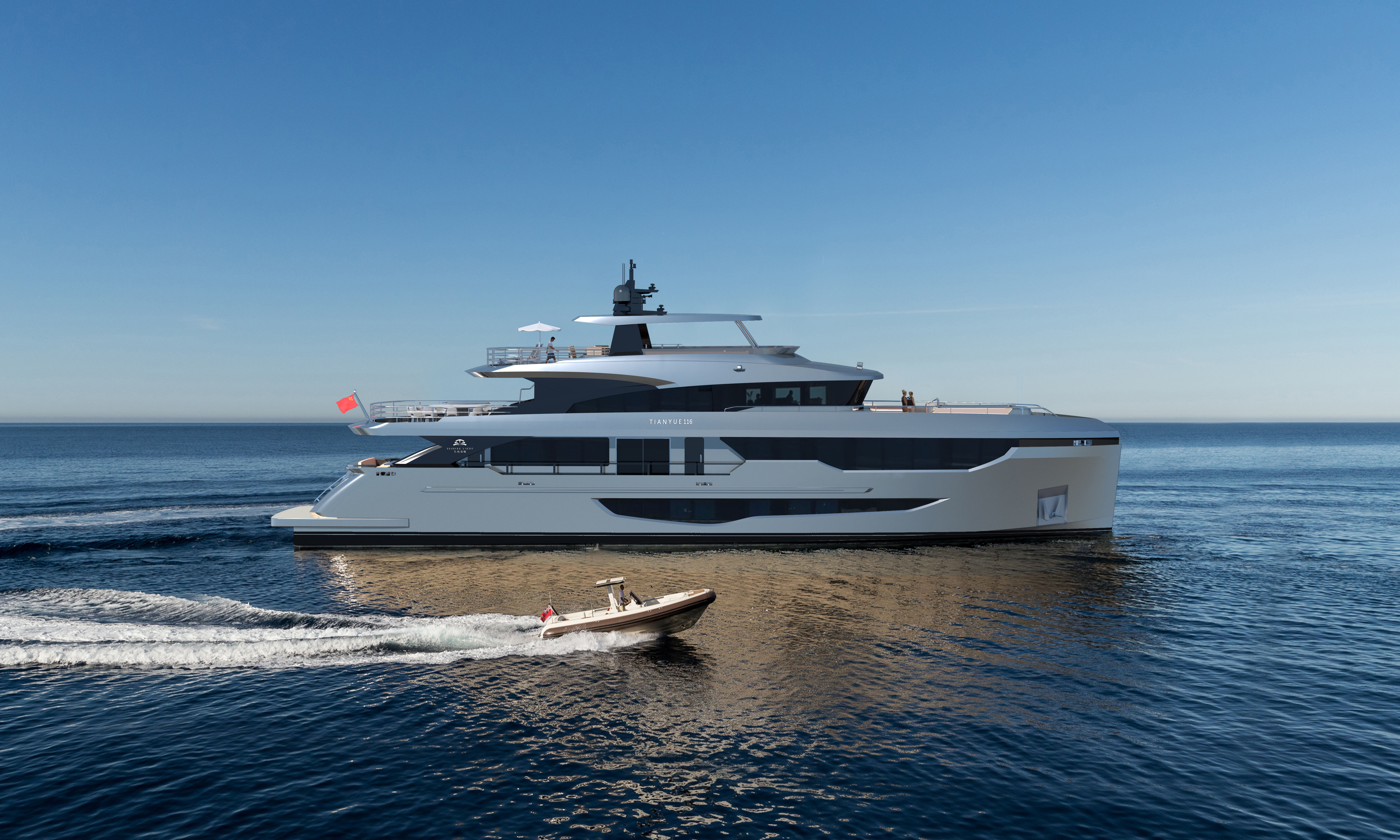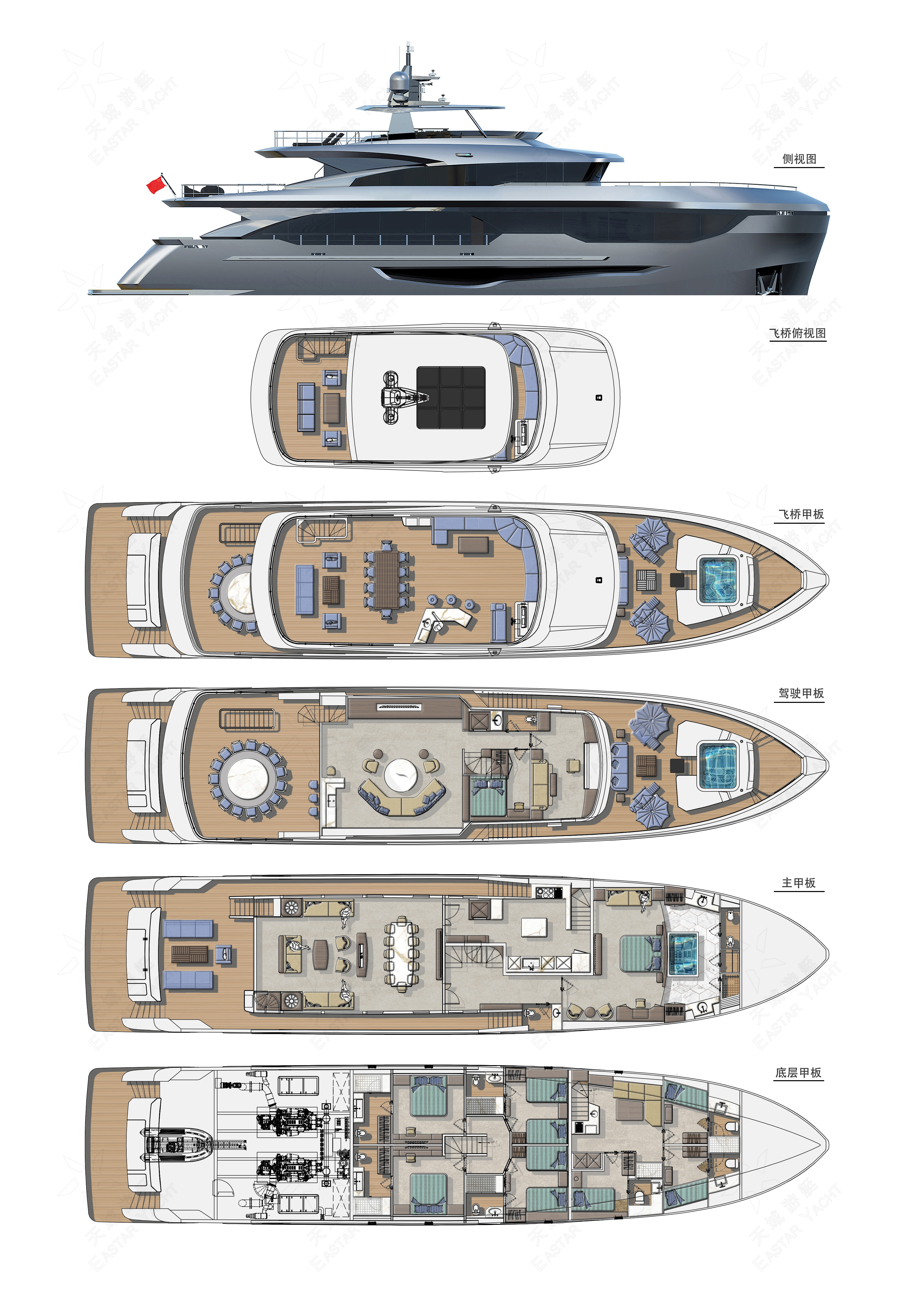 TY116是一款完美匯集了傳統(tǒng)和現(xiàn)代審美的超級游艇,在整體設(shè)計(jì)上,這款超艇有著簡潔動(dòng)感的外觀,干凈利落的線條,艙室空間和高度恰到好處的展現(xiàn)了超艇的舒適和豪華;主甲板和上層甲板的活動(dòng)區(qū)可以欣賞360°的海景,可同時(shí)接待8位以上親朋好友在超艇上游玩和休息,船尾艇庫設(shè)計(jì)是水上運(yùn)動(dòng)器材的良好存放場所。TY116除了具備舒適的航海性和空間感外,飛橋甲板區(qū)擁有比同類艇更寬敞的活動(dòng)空間和完善的戶外休閑功能,如大型按摩浴缸、日光浴區(qū)、躺椅、餐飲區(qū)、吧臺區(qū)等,還可供船主及賓客在星光夜空下舉辦不一樣的戶外盛宴。