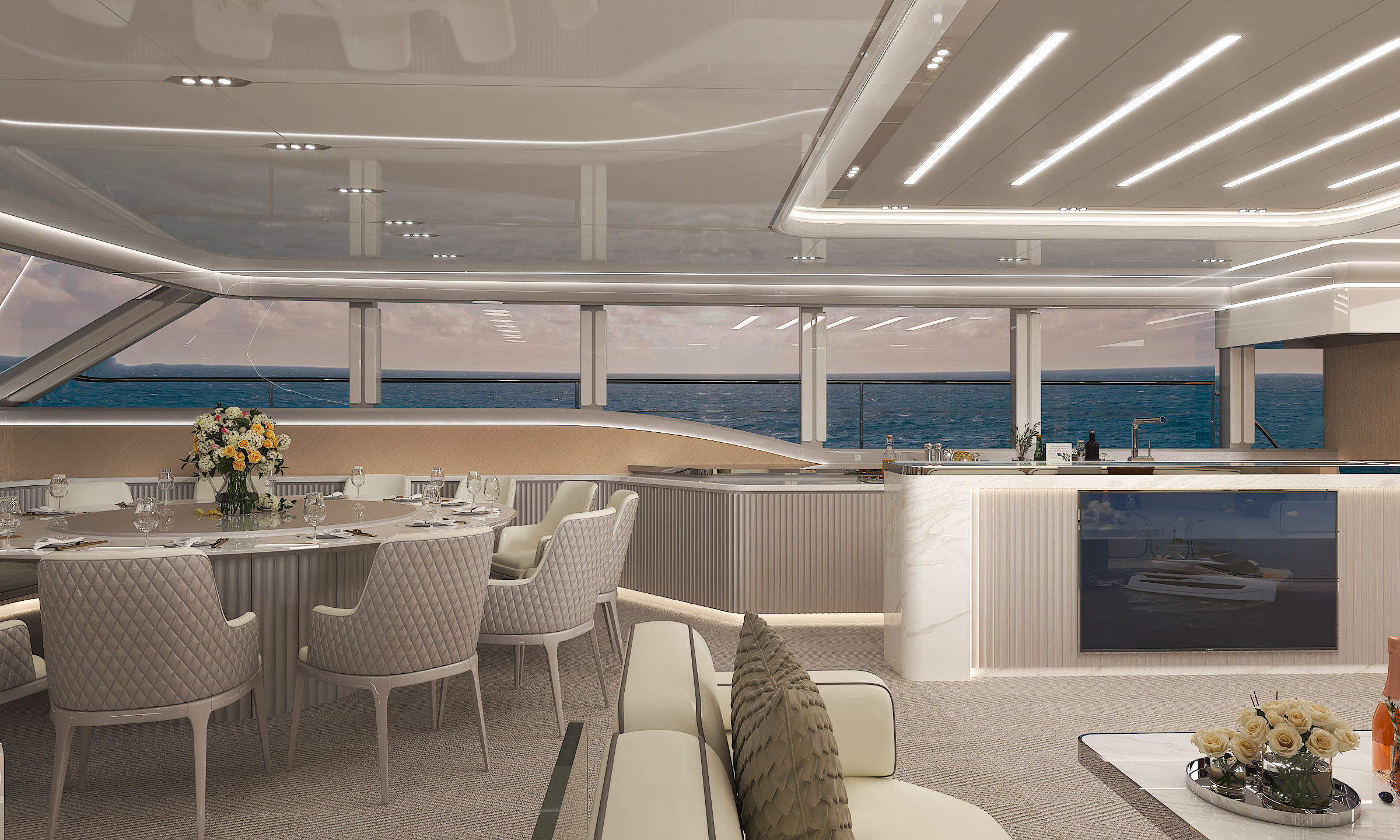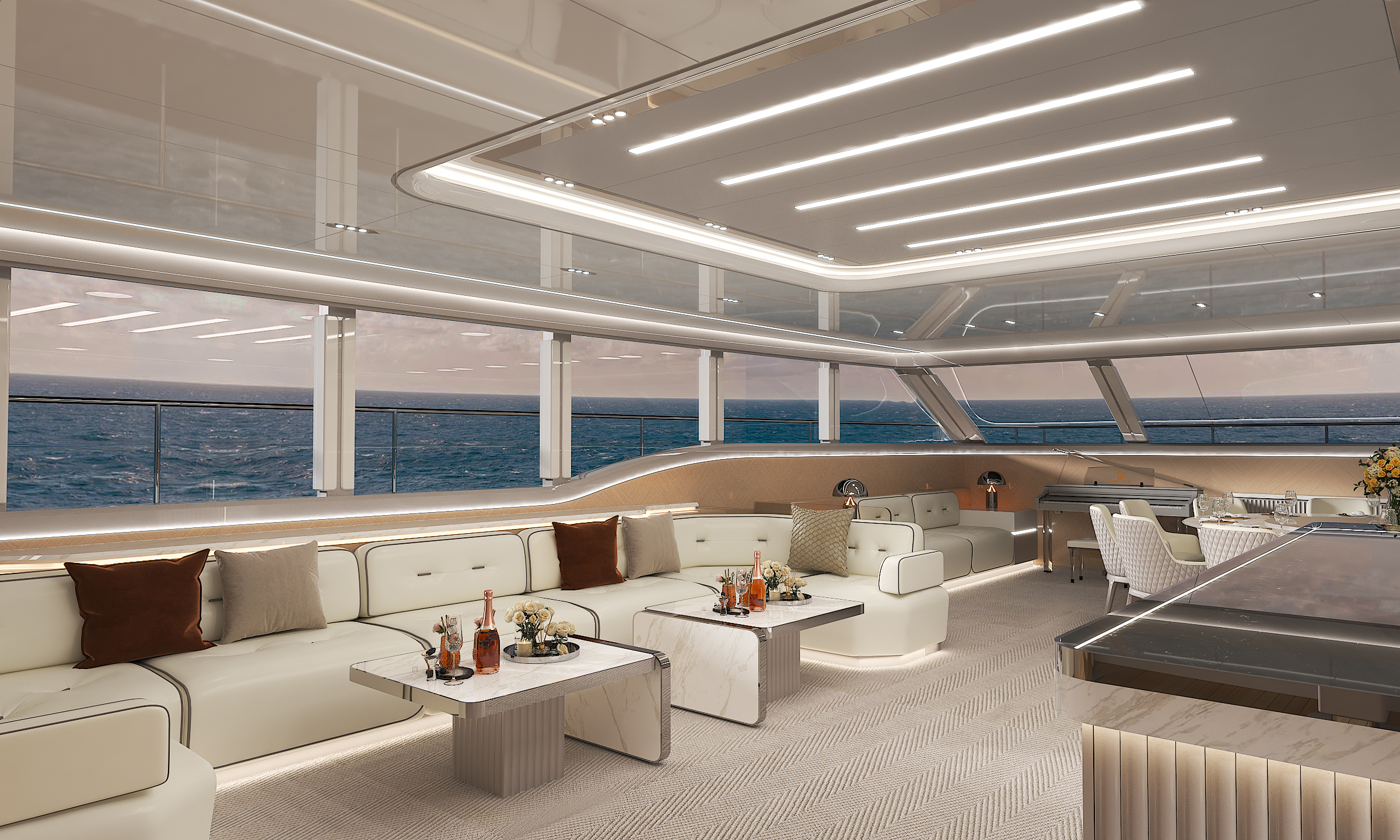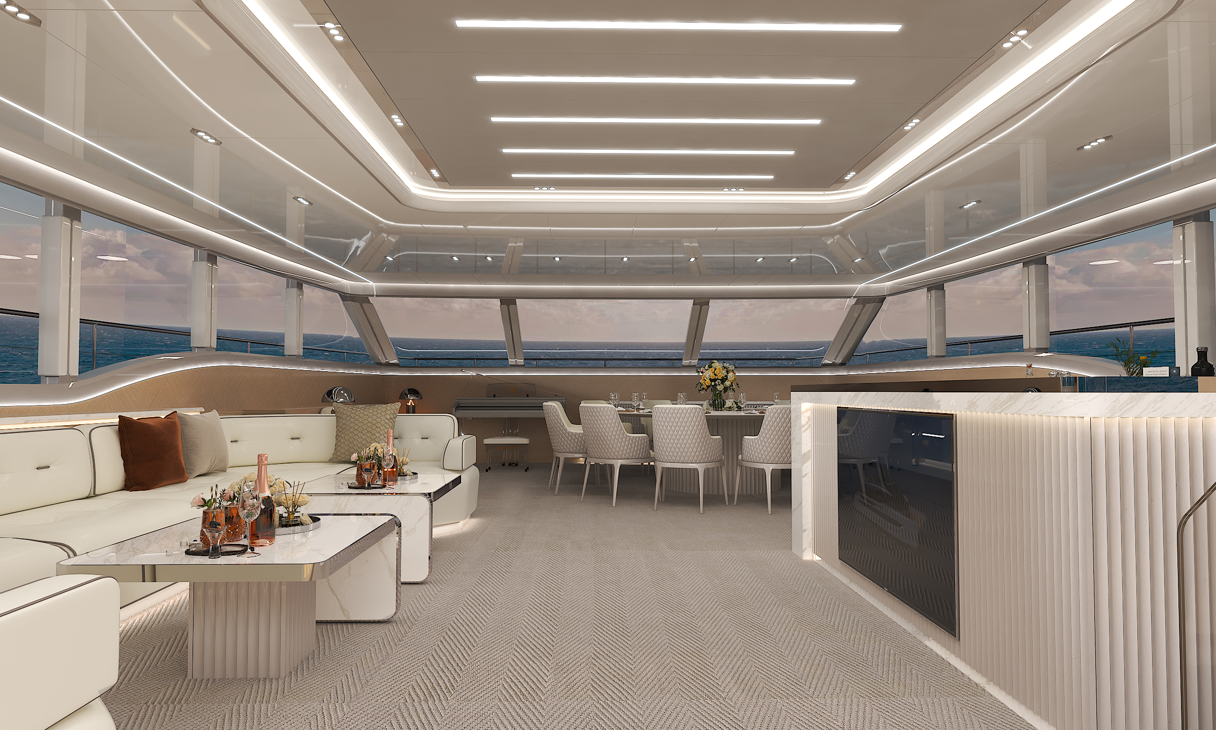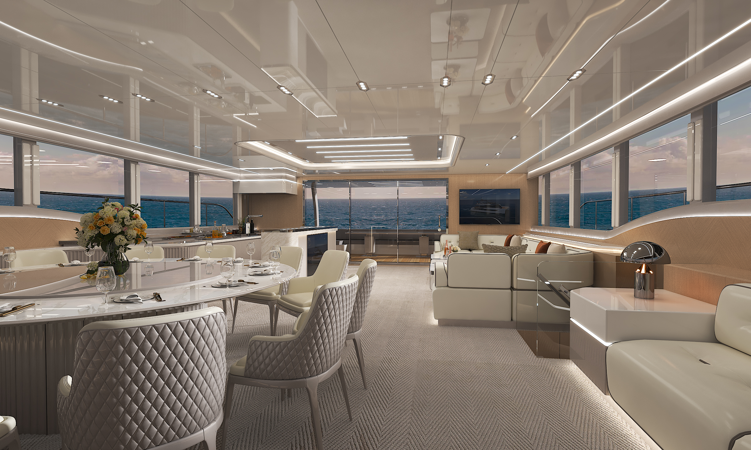 商務沙龍區(qū)堪稱海上多功能空間典范,超大視野窗戶打破空間界限,將海天盛景引入室內(nèi)。這里集餐飲、娛樂、休閑功能于一體,無論是商務洽談還是親友聚會,都能在奢華舒適的氛圍中完美進行。