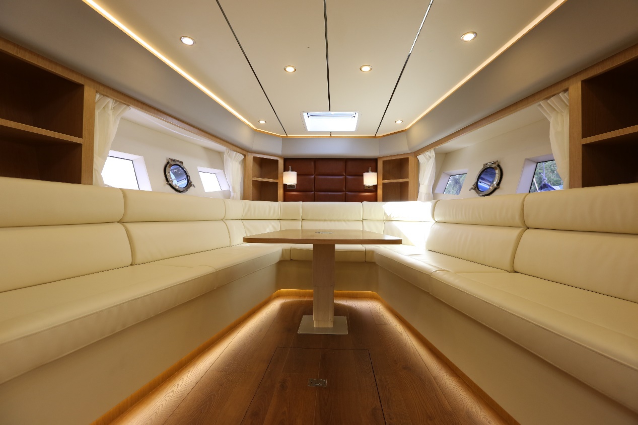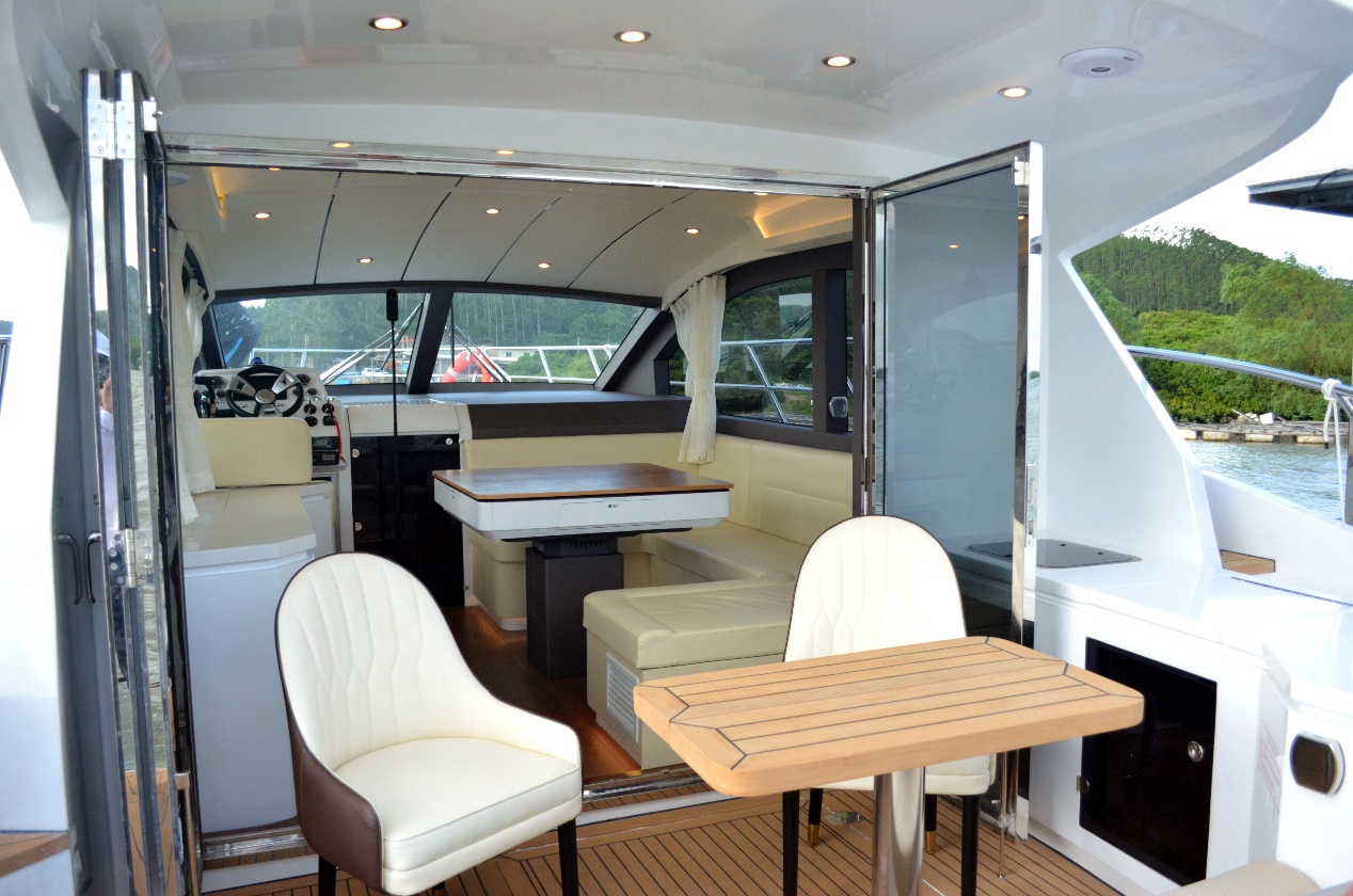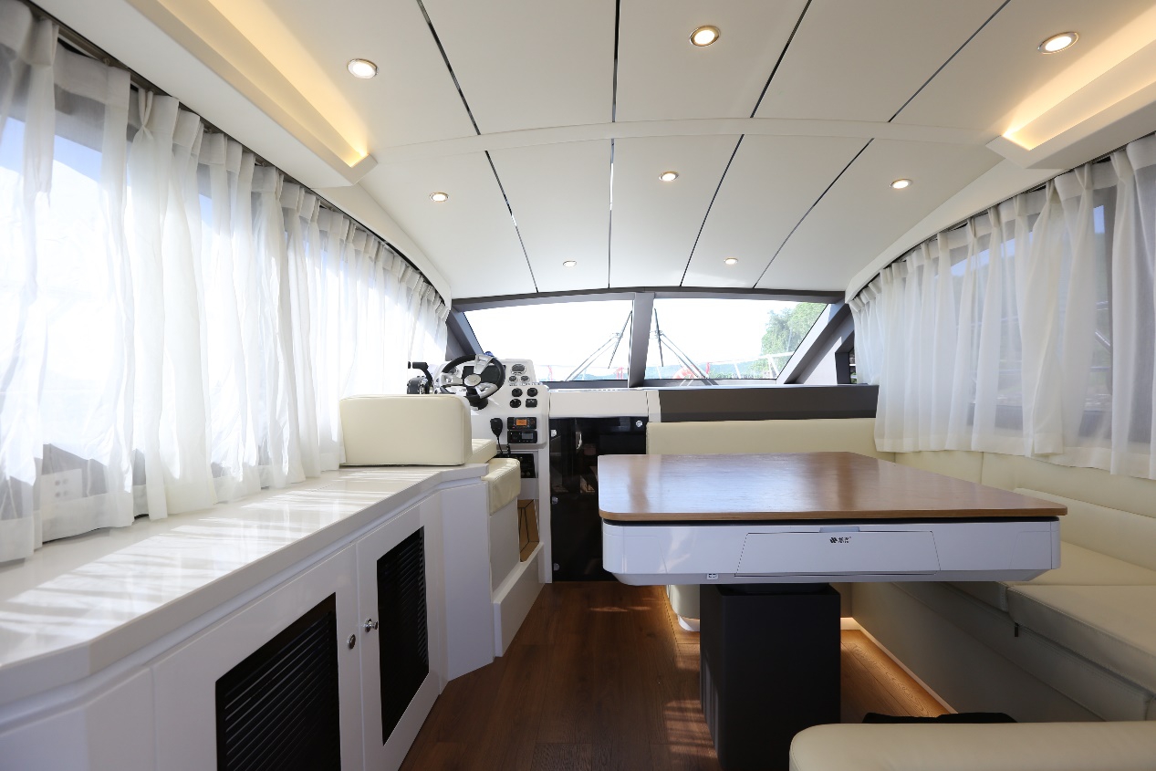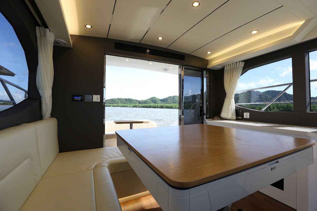 駕駛艙特色休閑功能,也是目前在同尺寸范圍唯一,在駕駛艙帶麻將桌的動(dòng)力艇。