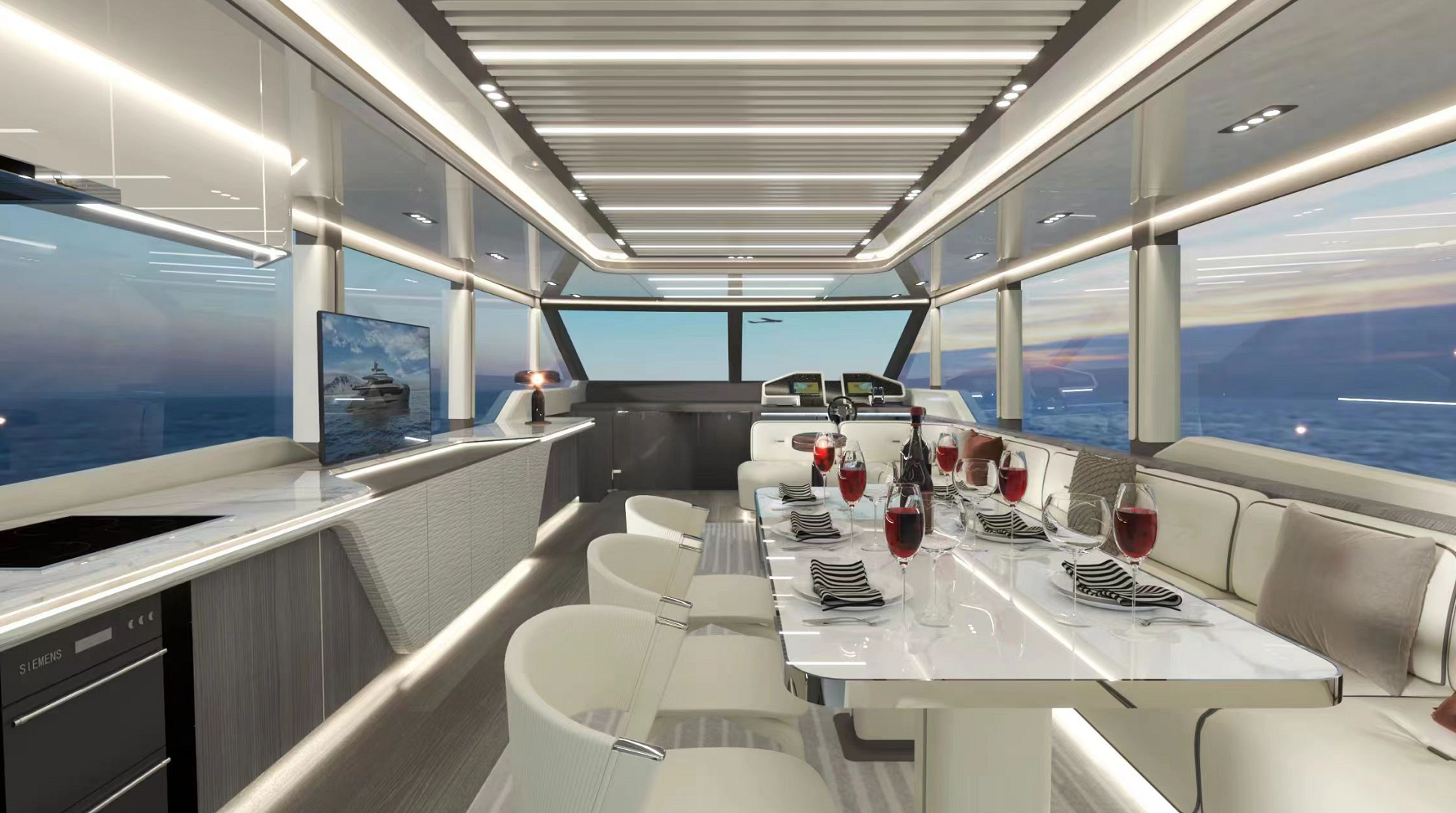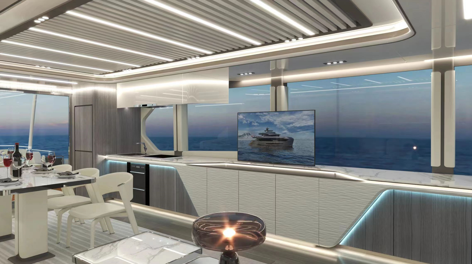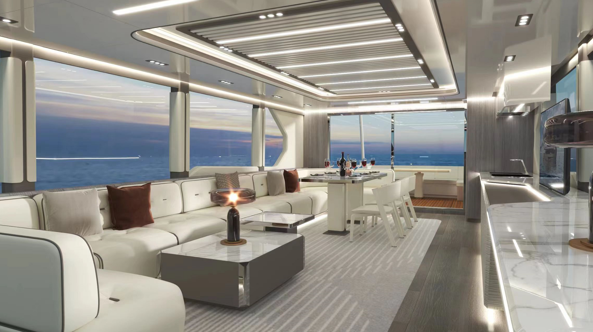 一體化定制的豪華商務沙龍,空間最大化,大窗戶審美設計同時也提升了甲板和內部整體空間的通透性。私人定制廚房,鮮美海鮮,精致點心,多樣化烹飪方案,滿足各類商務招待。觥籌交錯,暢飲一杯,可獨飲,可歡聚,私人與派對的多重空間,自在選擇,自如品鑒。