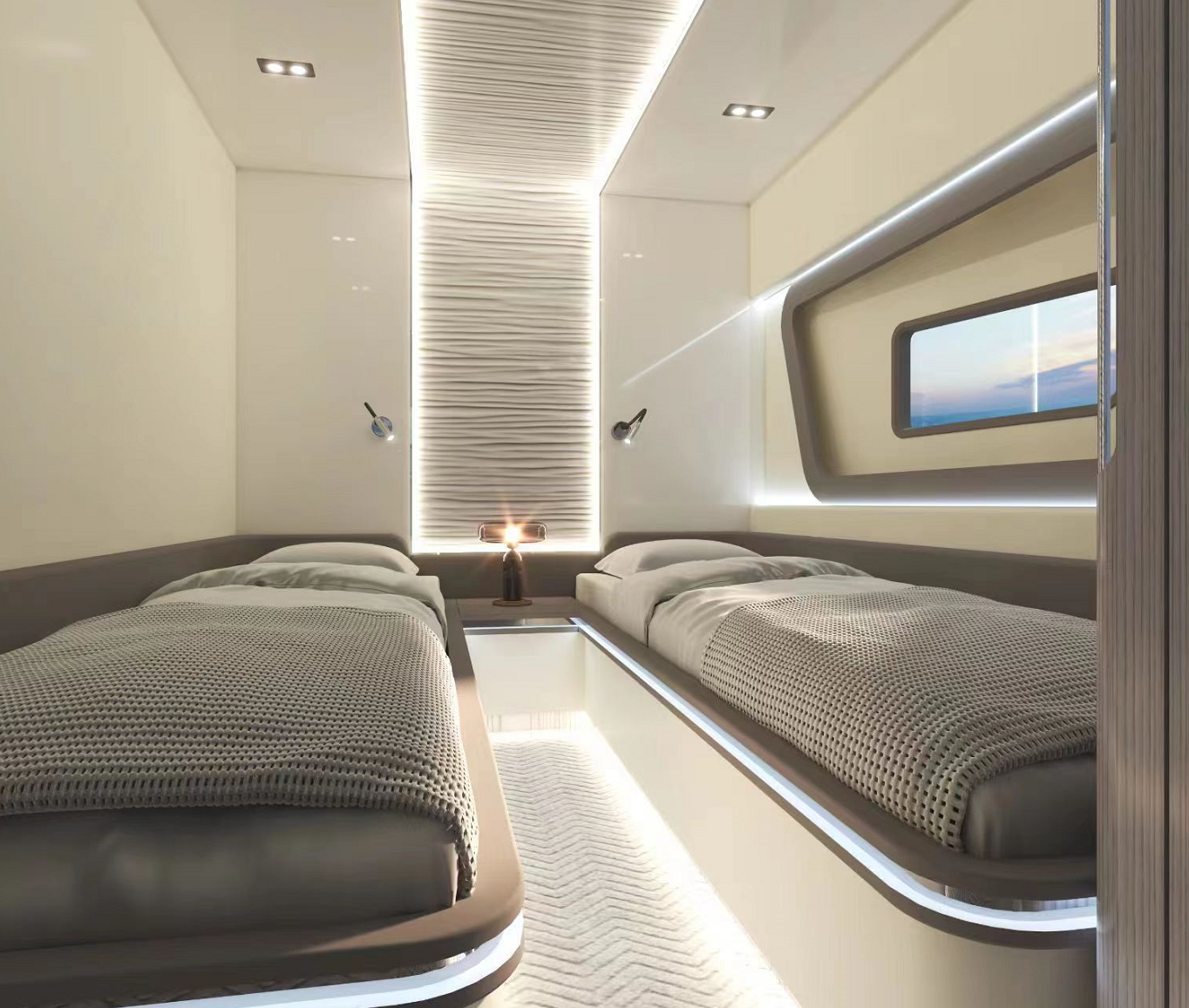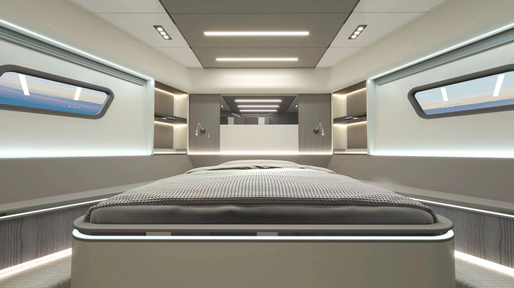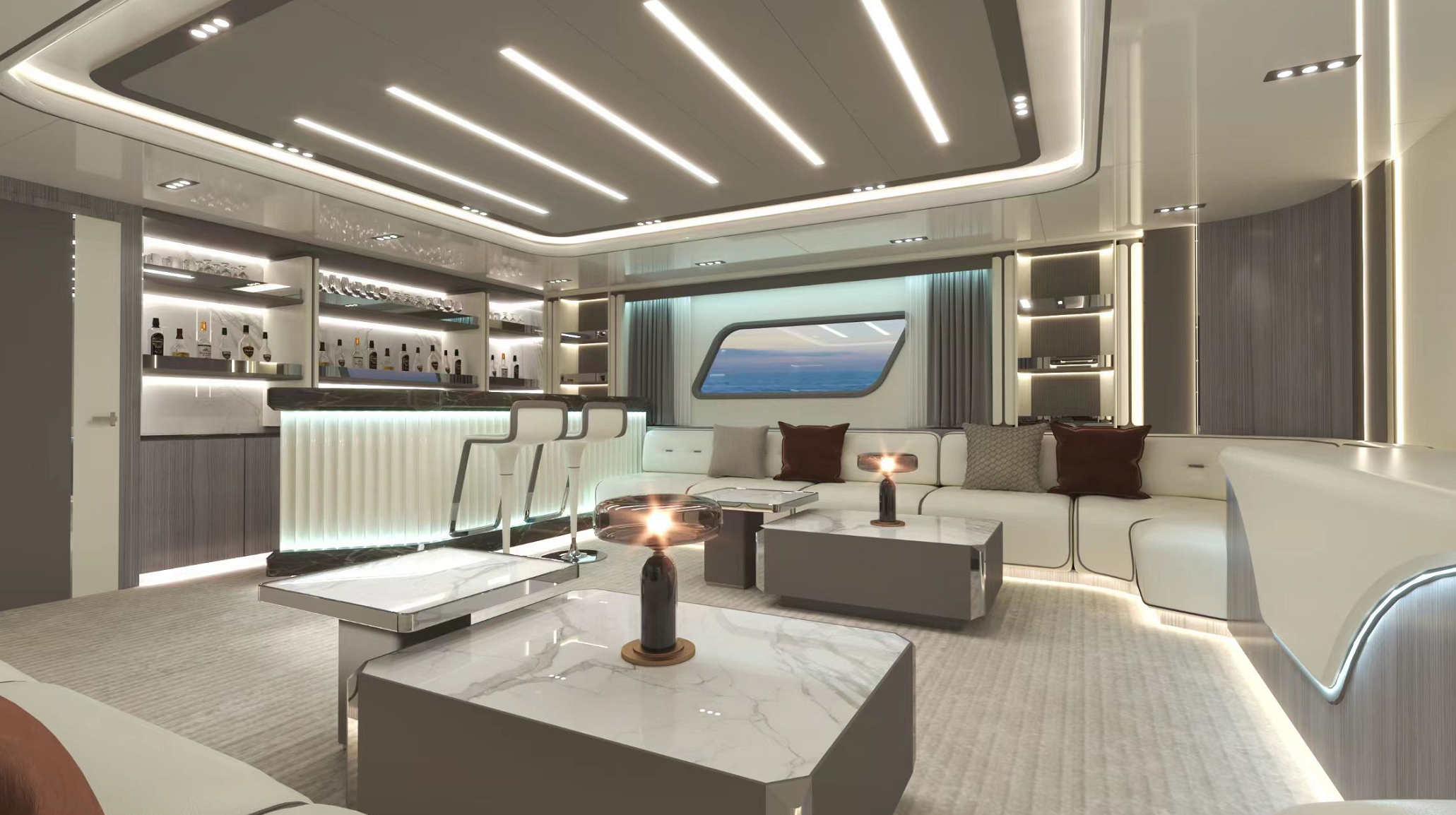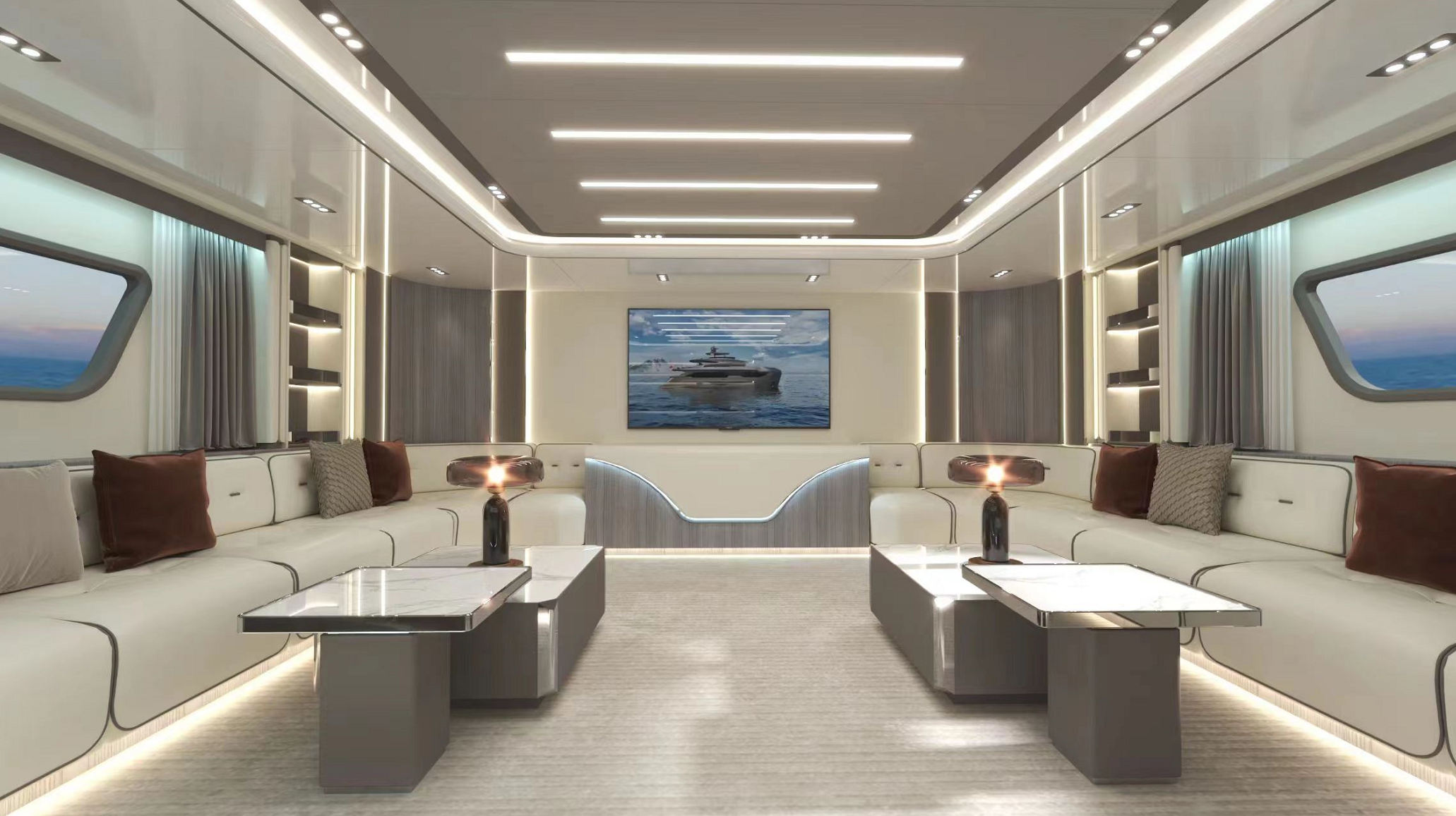 一體化定制的豪華商務沙龍,空間最大化,大窗戶審美設計同時也提升了甲板和內部整體空間的通透性。私人定制廚房,鮮美海鮮,精致點心,多樣化烹飪方案,滿足各類商務招待。觥籌交錯,暢飲一杯,可獨飲,可歡聚,私人與派對的多重空間,自在選擇,自如品鑒。