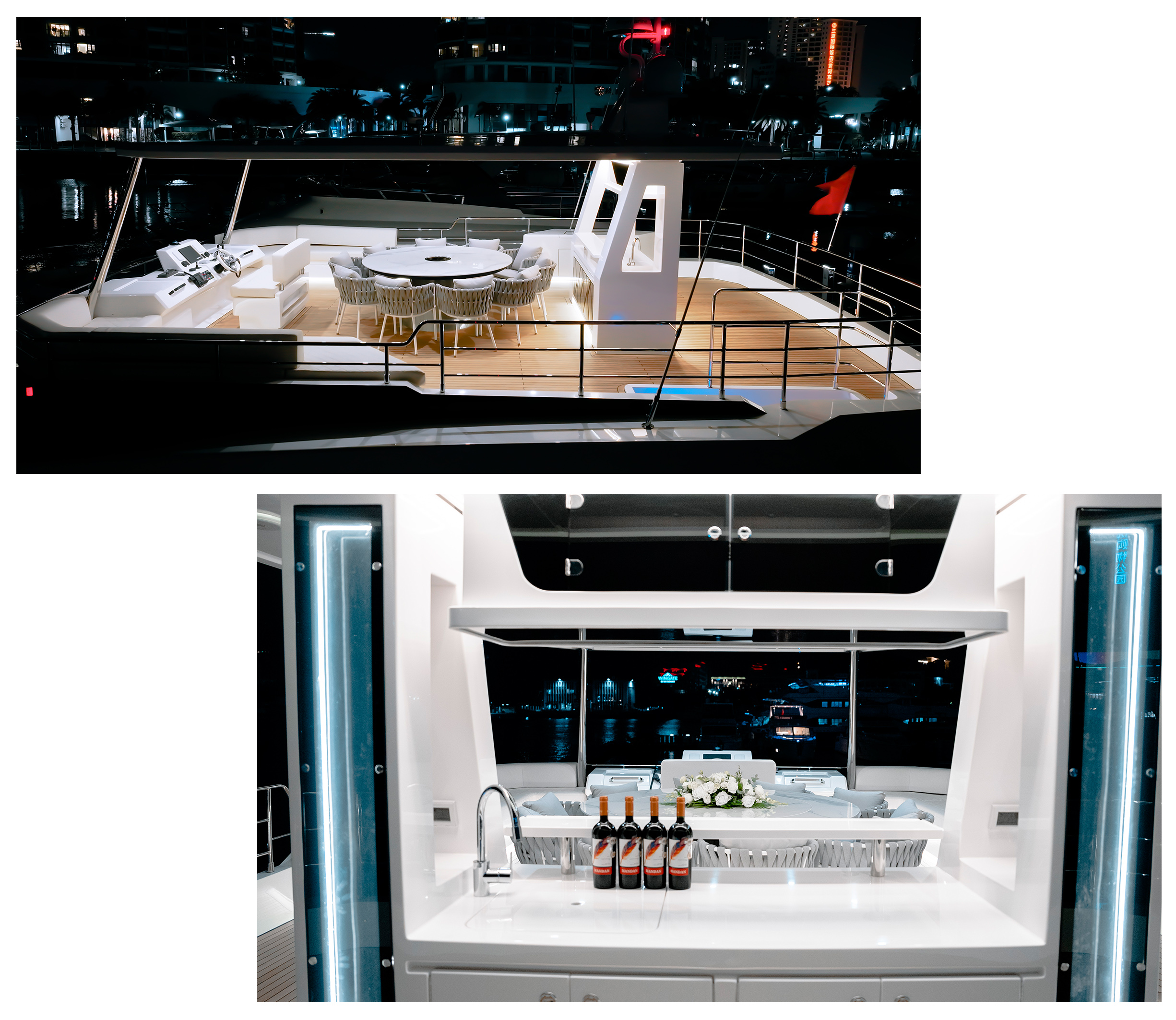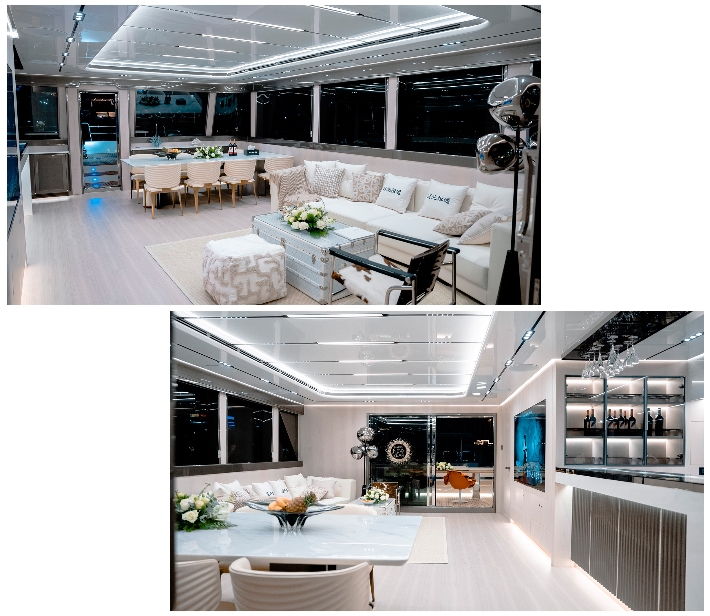 這款游艇的艉甲板及艏甲板均設(shè)有大面積沙發(fā)。當(dāng)游艇在大海中破浪前行,乘客可以愜意地坐在沙發(fā)上,沐浴著溫暖的陽光,吹拂著清新的海風(fēng),盡情感受馳騁海洋的無限快樂,享受與大海親密接觸的美好時光。