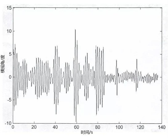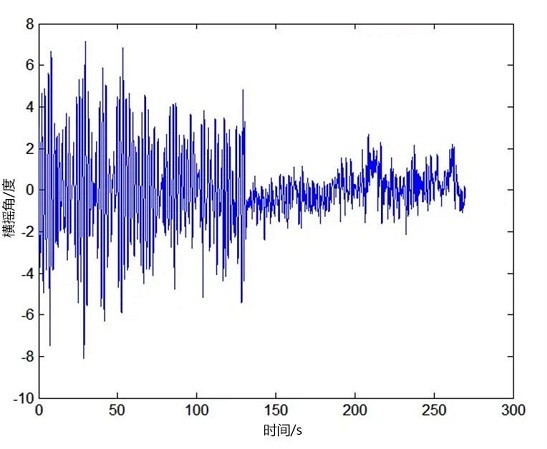 在正橫海浪下船舶橫搖減搖前后數(shù)據(jù)對比記錄,其中前半段波形為陀螺減搖裝置開始工作前船舶橫搖數(shù)據(jù)記錄,后半段波形為陀螺減搖裝置工作后船舶橫搖數(shù)據(jù)記錄。
